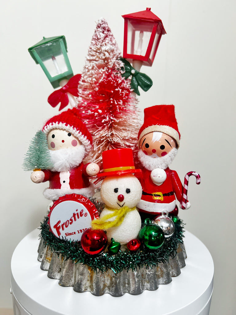 Vintage backing tart tin upside with several vintage Christmas elements like the Santa elves, snowman and lantern picks. An ombré bottle brush tree is the centerpiece to this adorable Christmas keepsake