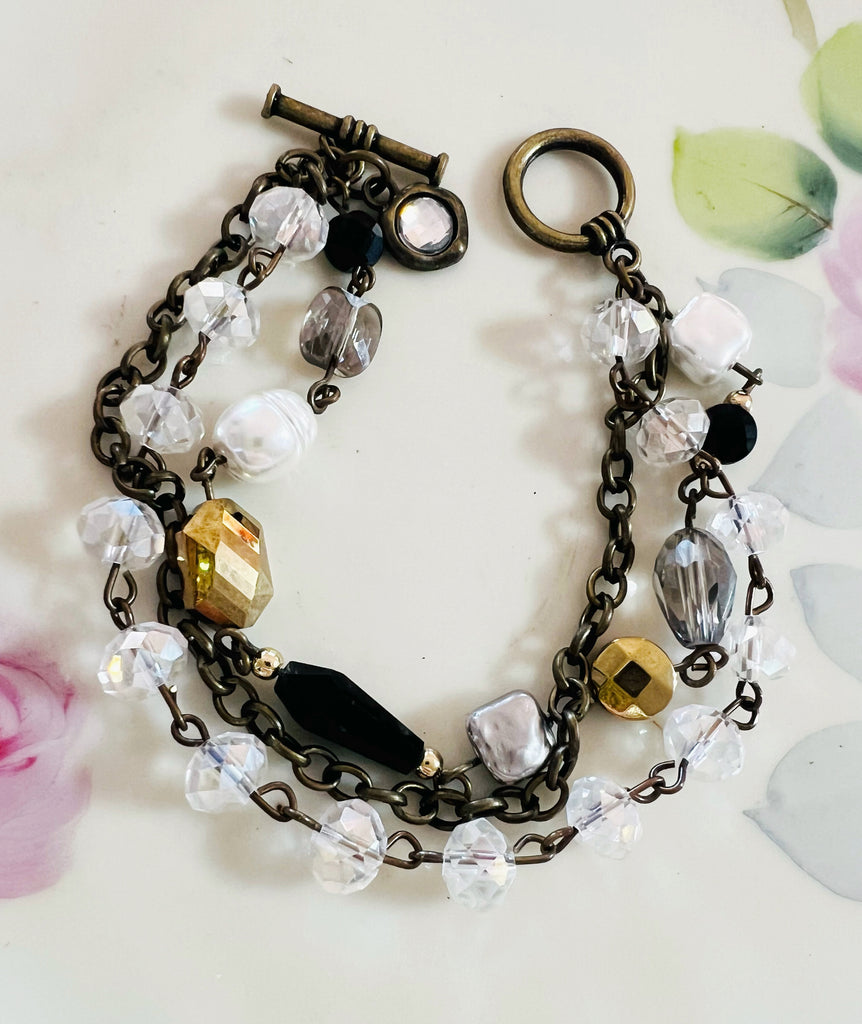 Metallic gold, pearl, and black beaded chain mixed with a clear crystal beaded chain next to an antique bronze chain create this stunner! rhinestone drop dangle charm