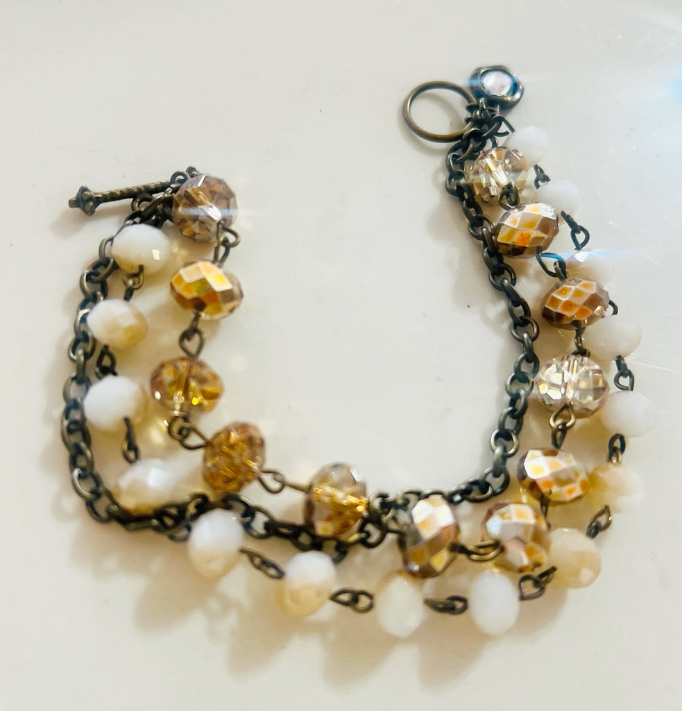 Golden metallic beaded chain, off white beaded chain with an antique bronze color chain on a toggle clasp Rhinestone dangle charm