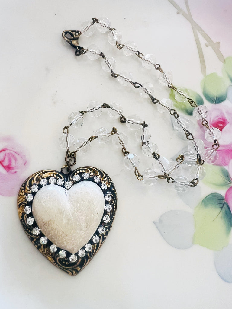 whitewash neutral color clay heart set on a brass patina stamped heart finding surrounded by clear crystal color rhinestone chain