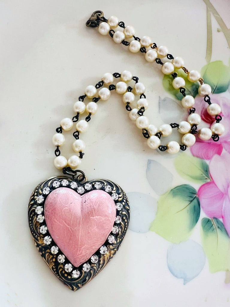 Handmade & hand painted clay heart on a patina brass filigree backing strung with a pearl beaded chain